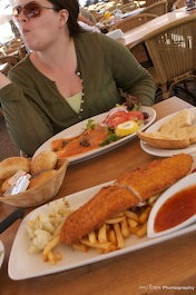 Food portions are much larger than one might expect. We shared a starter and one entree and couldn't finish them. The menu said Fish & Chips, but to be honest it was more like A fish and chips.